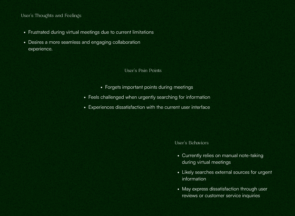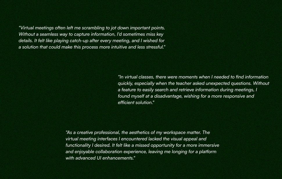 "Virtual meetings often left me scrambling to jot down important points. Without a seamless way to capture information, I'd sometimes miss key details. It felt like playing catch-up after every meeting, and I wished for a solution that could make this process more intuitive and less stressful."